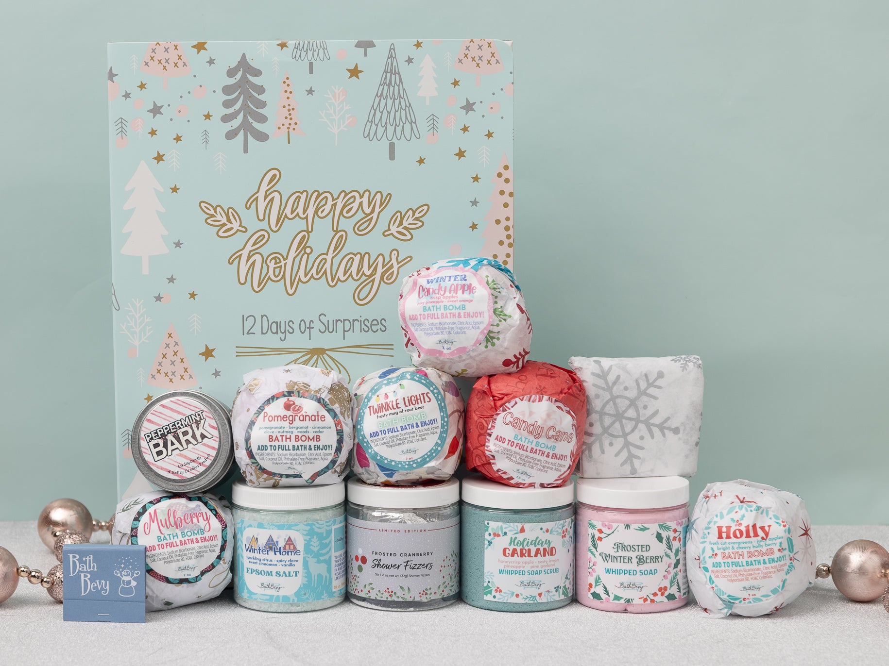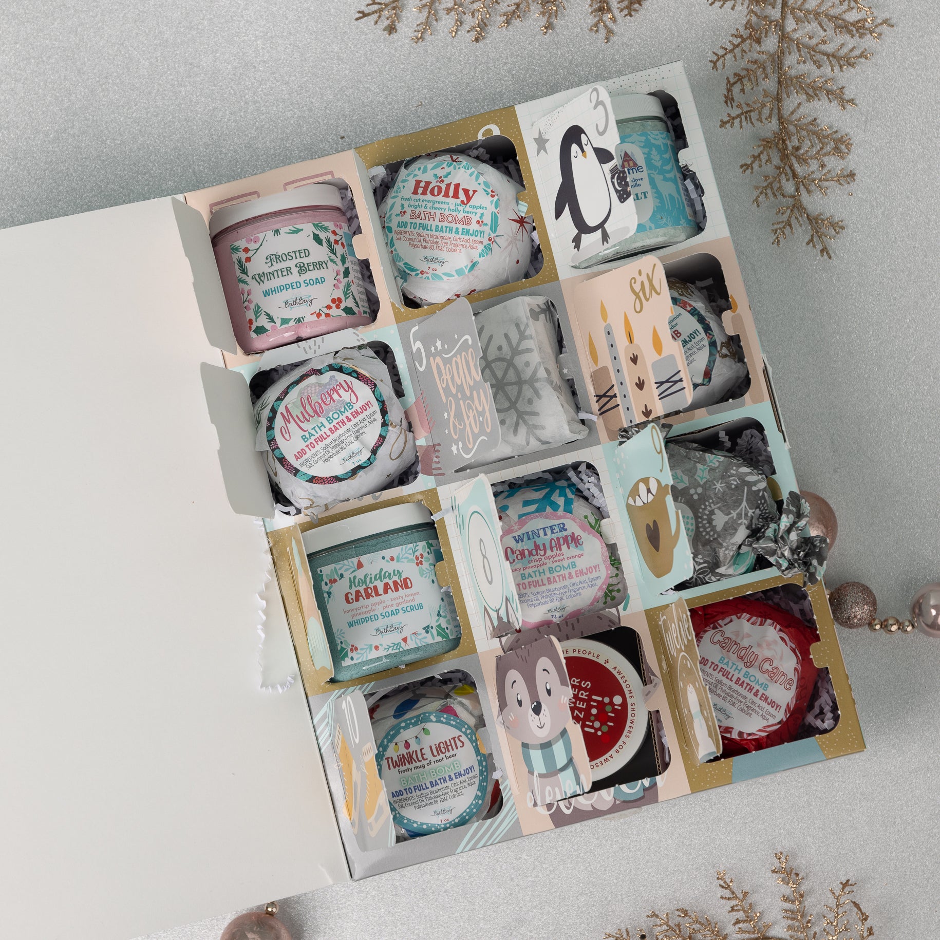 We don't want to spoil the surprise, but this advent box does contain several bath bombs, a whipped soap, a whipped soap scrub, shower steamers, a candle and more. This box is heavily bath-focused with winter-themed items.