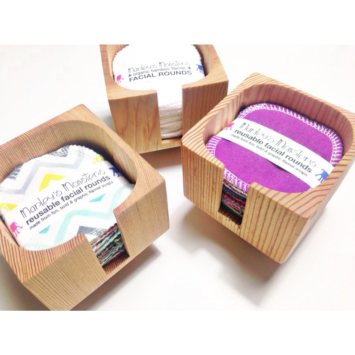 Our handmade wood containers are perfect for storing your reusable facial rounds in and include a finger slot for pulling your rounds out. They are carved out of a 3.5"x3.5" Douglas Fir block and finished with a natural tung oil. Each container is unique and will vary in color and grain.