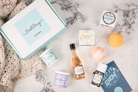 The theme for January: Let it Snow! Both the original and Tubless boxes include a Lavender Pajamas Whipped Soap Scrub, a Whipped Soap, and a Hot Cocoa Body Lotion. The original bath-focused box also included the Mimosa Bath Bomb, Hot Toddy Bath Bomb, Marshmallows by the Fire Bubble Bath. The Tubless version also includes Peppermint Eucalyptus Shower Steamers, Mimosa Shower Steamers, Marshmallows by the Fire Body Wash, and Champagne Dreams Soy Candle.