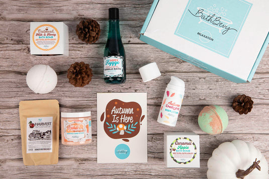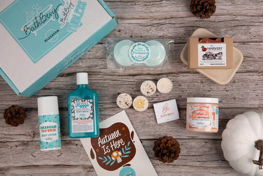 The theme for September: Autumn is Here! Both the original and Tubless boxes include a White Pumpkin Whipped Soap Scrub and a body lotion in either Pistachio Pumpkin or Autumn Delight. The original bath-focused box also included the Oatmeal, Milk, & Honey Bath Bomb, Caramel Apple Bath Bomb, Harvest Bubble Salt and Hygge Happy Bubble Bath. The Tubless version also includes Easy Breathe-y Shower Steamers, Hygge Happy Body Wash, Harvest Handmade Soap Bar, and Vanilla Soy Tealight Candles.