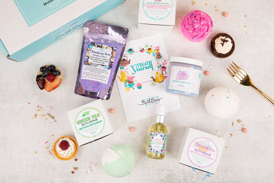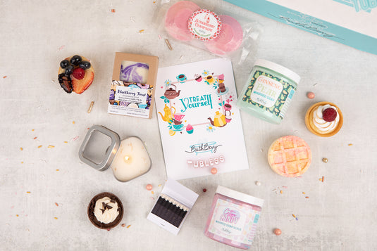 The theme for May: Treat Yourself! Both the original and Tubless boxes include a Cotton Candy Whipped Soap Scrub. The original bath-focused box also included the Sprinkles Bath Bomb, Green Tea Bath Bomb, a Bath and Body Oil and a Bath Bomb Cupcake. The Tubless version also includes the Strawberry Champagne Shower Steamers, Orange Cinnamon Waffle Shower Steamer, Blackberry Treat Handmade Soap Bar, Ginseng Pear Whipped Soapand Mackinac Island Fudge Soy Candle.