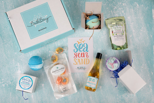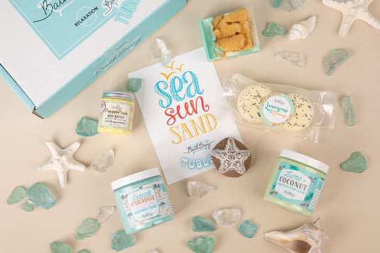The theme for August: Sea Sun Sand! The original bath-focused box includes the Vitamin Sea Bath Bomb, Just Beachy Bath Bomb, a Bath Bomb Cupcake in either Shark Encounter or Mermaid Kisses with a Bubble Taffy, Bubble Bath, and the Lime in the Coconut Bath Fizzy Dust. The Tubless version includes Lemongrass and Orange Shower Steamers, Lime in the Coconut Sea Sponge Handmade Soap Bar, a Whipped Soap, a Whipped Soap Scrub, and a Pineapple Punch Body Butter.