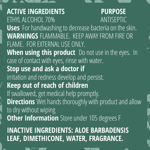 Our sanitizer contains 70% Ethyl Alcohol which is over the CDC’s guidance of 60% or more with added aloe vera to care for your skin!