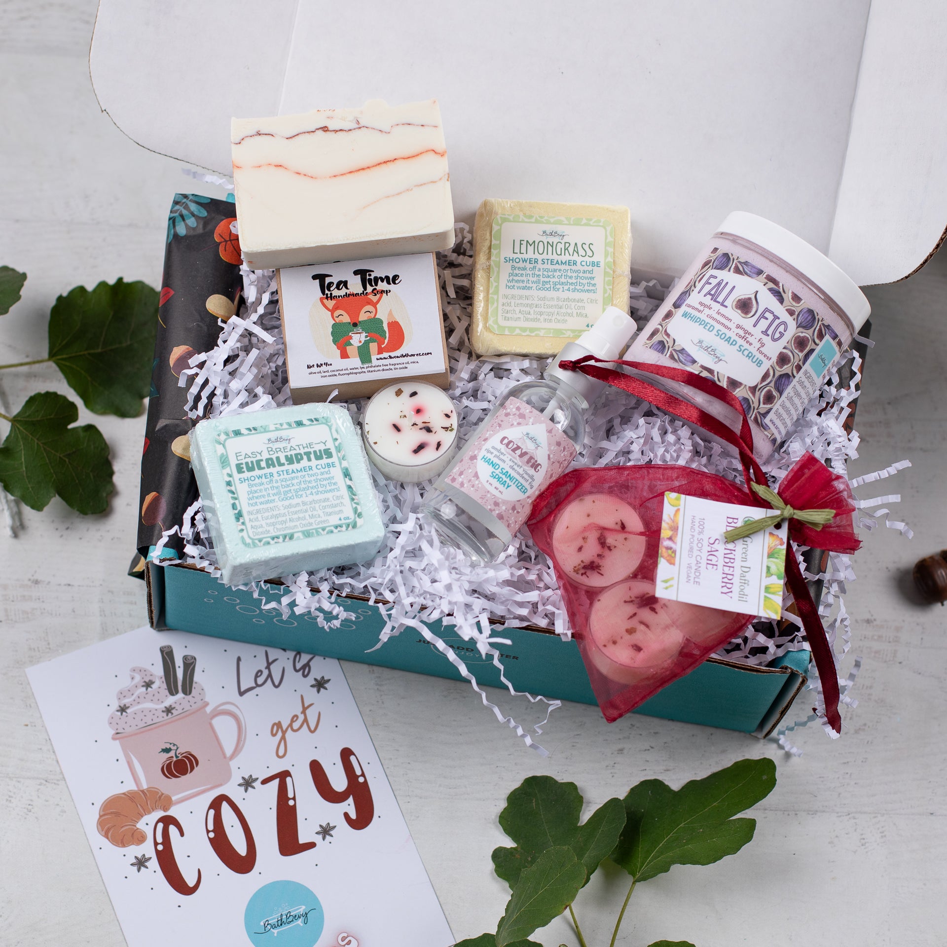 Bath and body product packaging with 'Let's get cozy' card on a wooden surface with leaves.