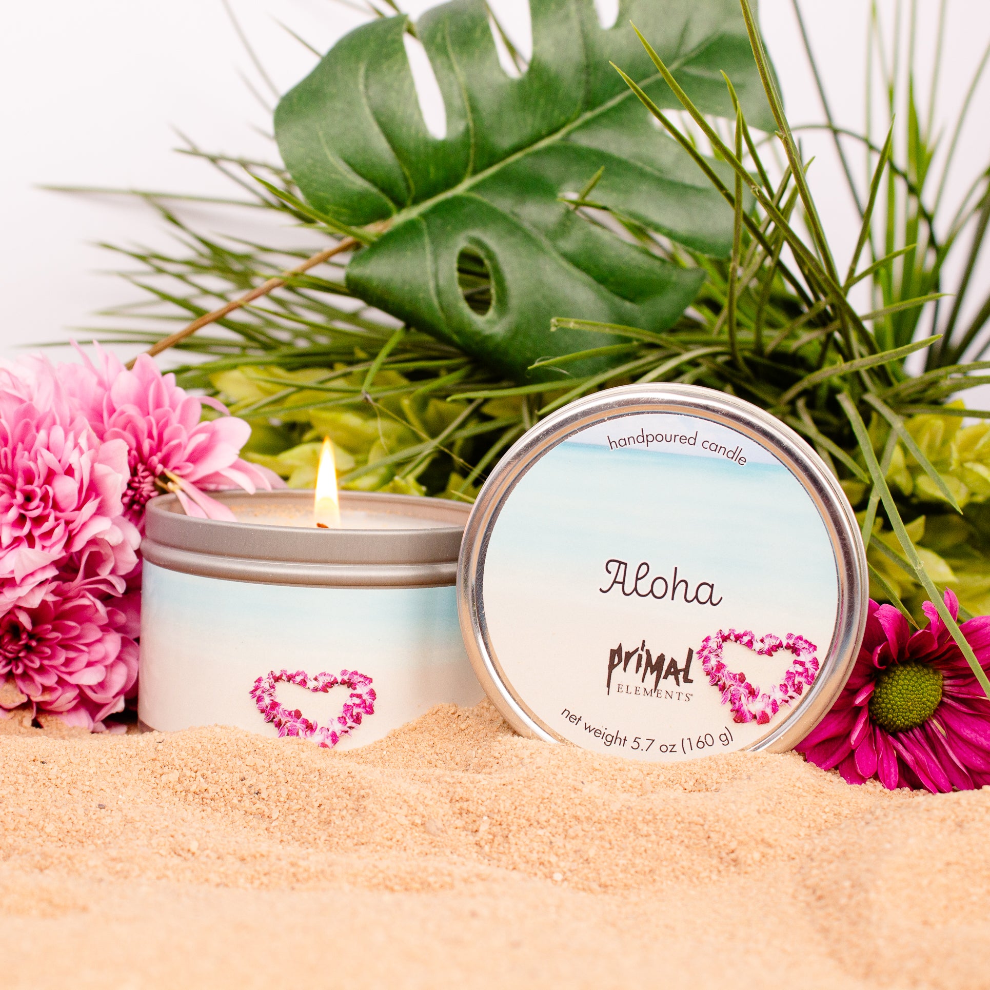 ALOHA TRAVEL TIN CANDLE by Primal Elements  A warm island greeting wrapped in sunny citrus, sweet sugar and juicy tropical fruit. Offers 30-35 hours of aromatic delight.