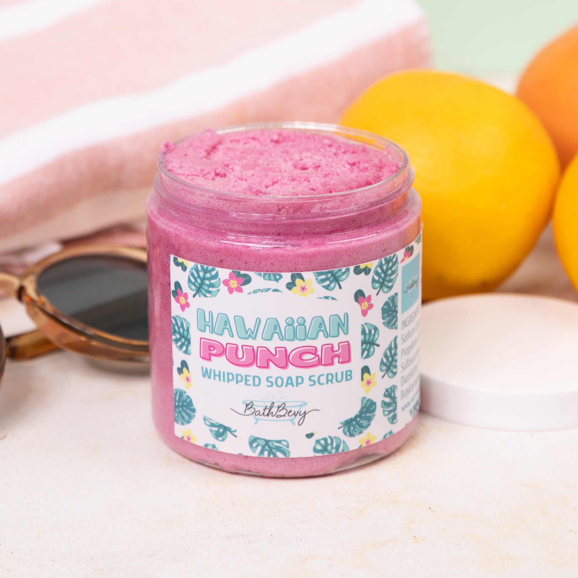SUMMER BEACH PARTY WHIPPED SOAP SCRUB This light and fluffy whipped soap scrub is a luxurious exfoliating cleanser that will leave your skin feeling clean, soft and moisturized without any greasy or sticky feel. Scent possibilities this month are: Paradise Punch, Tropical Smoothie or Hawaiian Punch