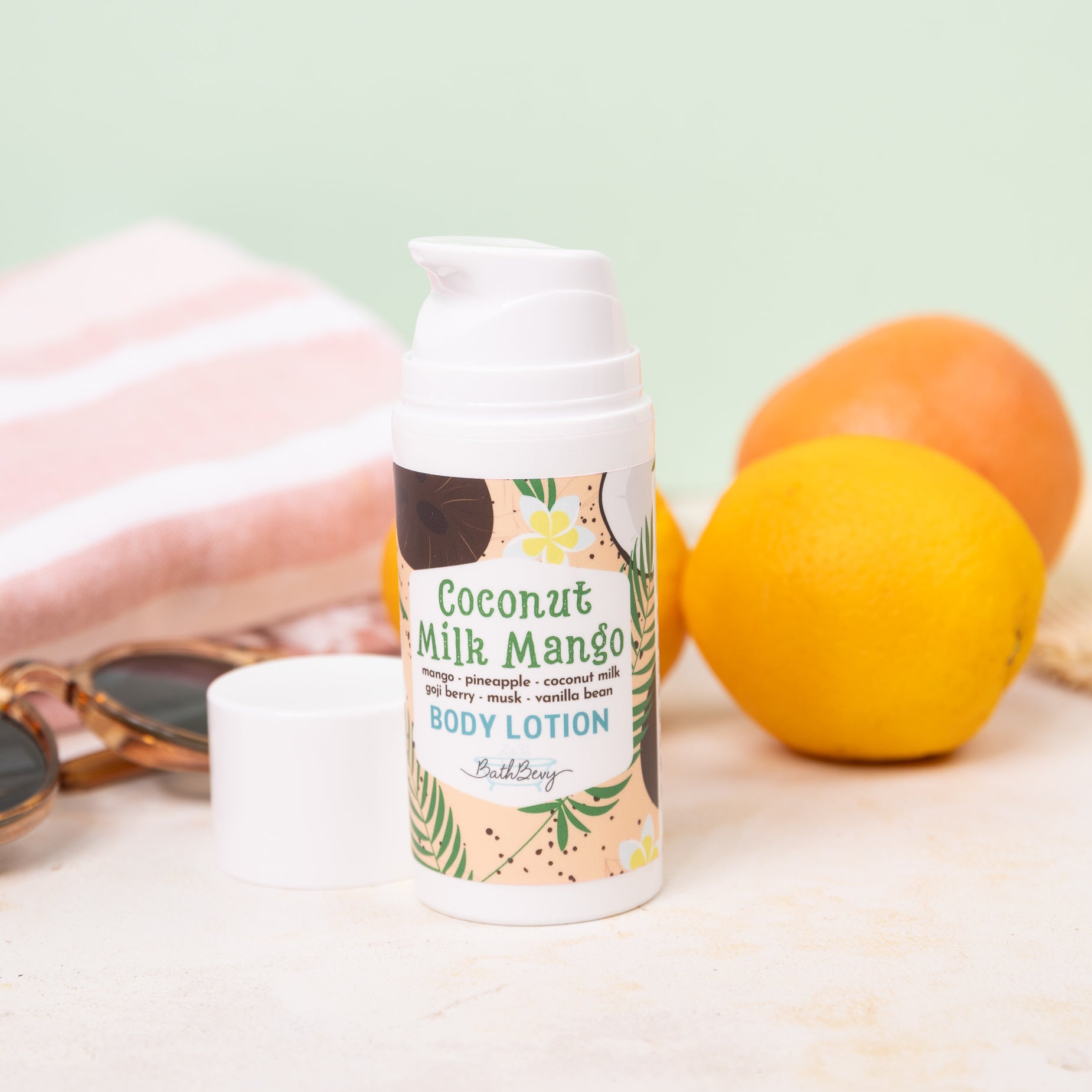 COCONUT MILK MANGO BODY LOTION Keep dry skin at bay with your super cute Body Lotion. This tropical fragrance of mango, pineapple, goji berry and coconut milk is sweetened with soft musk and vanilla bean.