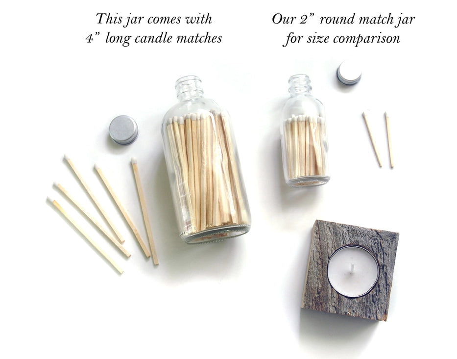 Light a spark with this bottle full of extra-long 4" powder blue-tipped candle matches! Each tall, round glass bottle contains about sixty (60) over-sized, 4" long wooden matches with natural stems and robin's egg blue tips. These long-burn candle matches are 4" long to prevent your fingers from burning when lighting tall candles. A convenient striker strip is incorporated into a simple, signature label on one side. The jar comes with a water-tight metal lid. Take your matches anywhere, or keep them on your mantle looking tidy. A moment of calm or a celebration in a bottle...