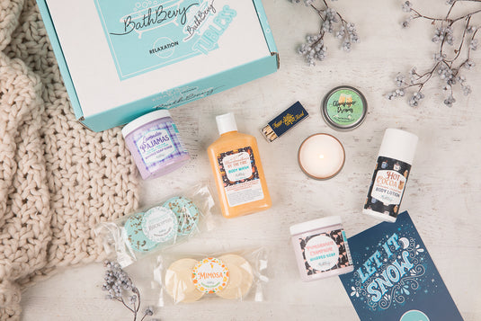 The theme for January: Let it Snow! Both the original and Tubless boxes include a Lavender Pajamas Whipped Soap Scrub, a Whipped Soap, and a Hot Cocoa Body Lotion. The original bath-focused box also included the Mimosa Bath Bomb, Hot Toddy Bath Bomb, Marshmallows by the Fire Bubble Bath. The Tubless version also includes Peppermint Eucalyptus Shower Steamers, Mimosa Shower Steamers, Marshmallows by the Fire Body Wash, and Champagne Dreams Soy Candle.