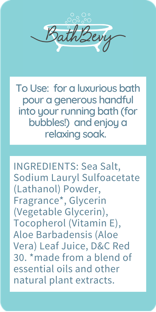 INGREDIENTS: Sea Salt, Sodium Lauryl Sulfoacetate (Lathanol) Powder, Fragrance*, Glycerin (Vegetable Glycerin), Tocopherol (Vitamin E), Aloe Barbadensis (Aloe Vera) Leaf Juice, D&C Red 30. *made from a blend of essential oils and other natural plant extracts.
